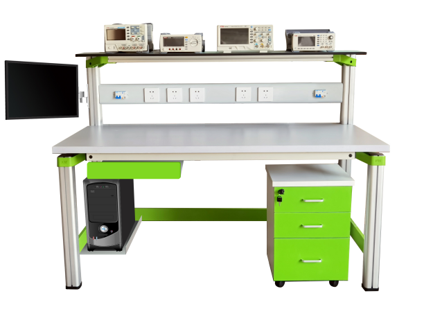 實(shí)訓(xùn)桌規(guī)格為1400(長(zhǎng))*700(寬)*1150(高),設(shè)有一個(gè)鍵盤托一個(gè)抽屜,桌子下部靠后右邊有一個(gè)電腦主機(jī)箱托。實(shí)驗(yàn)桌主體結(jié)構(gòu)全部采用高性能表面氧化的鋁型材及一次成型鋁壓鑄框架連接構(gòu)件,連接構(gòu)件采用壓鑄成型工藝(非焊接工藝),經(jīng)機(jī)加工、拋丸、噴砂,表面靜電噴涂工藝,安裝方便、快捷,用戶可自行DIY組裝。桌體立柱采用工業(yè)鋁型材成型工藝,表面氧化處理,截面尺寸:70mm×70mm,四面帶槽,槽寬約8mm,端部裝有注塑成型配套塑料堵頭。桌面采用25mmE1級(jí)三聚氰胺飾面板,桌面板下設(shè)支撐框架,承受力不少于300kg。配備儲(chǔ)存柜,存放元件及工具,儲(chǔ)存柜底部4只高強(qiáng)度萬(wàn)向可制動(dòng)PU腳輪,方便移動(dòng)。實(shí)訓(xùn)裝置整體簡(jiǎn)約不簡(jiǎn)單,高端大氣,符合現(xiàn)代化產(chǎn)品審美和發(fā)展趨勢(shì)。