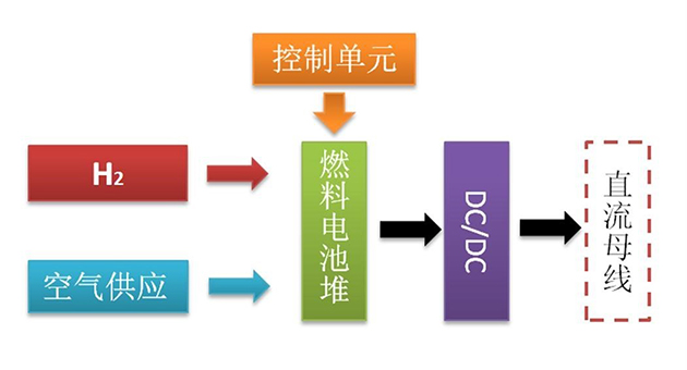 其工作原理是光伏發(fā)電系統(tǒng)所發(fā)電能由電池儲(chǔ)能,DC/AC逆變成交流電,驅(qū)動(dòng)電解水設(shè)備制氫。氫氣通過(guò)儲(chǔ)氫系統(tǒng)儲(chǔ)存,并驅(qū)動(dòng)燃料電池電堆發(fā)電。