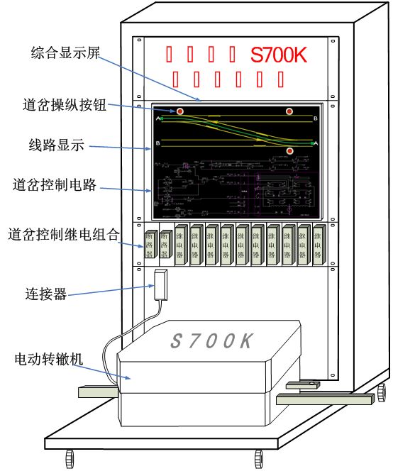 提速道岔S700K轉(zhuǎn)轍機大量用于城市軌道交通正線,實訓演練平臺由信號組合柜、信號繼電器、S700K三相交流電動轉(zhuǎn)轍機、線路及控制電路狀態(tài)顯示計算機、顯示屏、多路數(shù)字量驅(qū)動采集模塊、24V電源模塊、220V轉(zhuǎn)380V電源模塊、斷路器、道岔控制組合板、練功平臺車等設備組成。設備外觀結(jié)構(gòu)如下圖所示。
