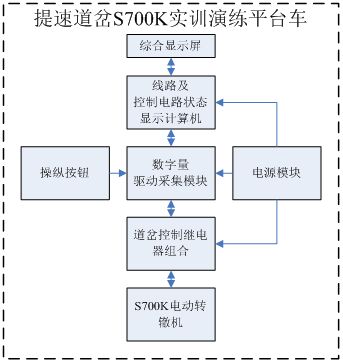 提速道岔S700K實訓演練平臺通過道岔操縱按鈕接通道岔控制電路,控制S700K轉(zhuǎn)轍機的定、反位的動作。在接通道岔啟動電路時、轉(zhuǎn)轍機轉(zhuǎn)換到相應的位置并給出定/反位表示表示后,在綜合顯示屏上顯示繼電器線圈和接點狀態(tài),并連通相應的表示電路,點亮對應的表示燈。當轉(zhuǎn)轍機不到位或故障時,給出相應提示。此練功平臺能使學員在較小的室內(nèi)空間內(nèi)實際操作和拆解轉(zhuǎn)轍機,達到身臨其境的感覺。同時通過道岔控制電路的實時顯示,直觀的反映電路的動作情況,從而達到常規(guī)現(xiàn)場教學無法達到的效果。平臺各部件間接口如下圖所示: