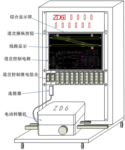 ZD6轉(zhuǎn)轍機主要用于城軌車輛段,實訓演練平臺由信號組合柜、道岔控制組合板、信號繼電器、ZD6電動轉(zhuǎn)轍機、線路及控制電路狀態(tài)顯示計算機、顯示屏、多路數(shù)字量驅(qū)動采集模塊、24V電源模塊、直流220V道岔動作電源、斷路器、練功平臺車等設備組成。設備外觀結(jié)構(gòu)如下圖所示。