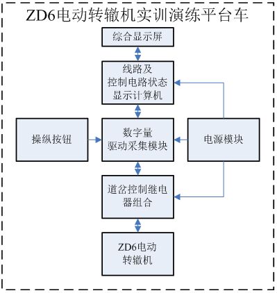 ZD6轉(zhuǎn)轍機實訓演練平臺通過道岔操縱按鈕接通道岔控制電路,控制ZD6轉(zhuǎn)轍機的定、反位的動作。在接通道岔啟動電路時、轉(zhuǎn)轍機轉(zhuǎn)換到相應的位置并給出定/反位表示表示后,在綜合顯示屏上顯示繼電器線圈和接點狀態(tài),并連通相應的表示電路,點亮對應的表示燈。當轉(zhuǎn)轍機不到位或故障時,給出相應提示。此練功平臺能使學員在較小的室內(nèi)空間內(nèi)實際操作和拆解轉(zhuǎn)轍機,達到身臨其境的感覺。同時通過道岔控制電路的實時顯示,直觀的反映電路的動作情況,從而達到常規(guī)現(xiàn)場教學無法達到的效果。平臺各部件間接口如下圖所示: