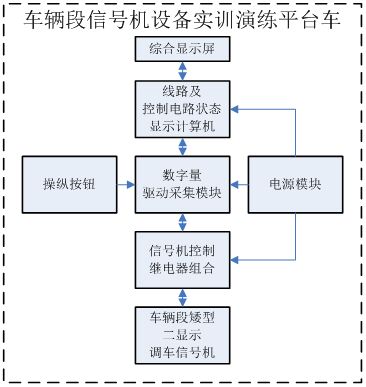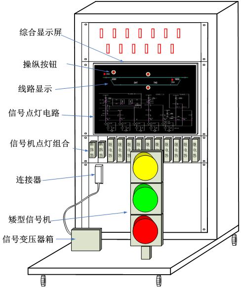 車輛段信號機設備實訓演練平臺由信號組合柜、信號繼電器、二顯示矮型調(diào)車信號機、信號變壓器、燈絲繼電器、XB箱、信號機及控制電路狀態(tài)顯示計算機、顯示屏、電源模塊、數(shù)字量驅(qū)動采集模塊、斷路器、練功平臺車等設備組成,設備外觀結(jié)構(gòu)如下圖所示。