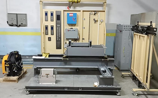 曳引系統(tǒng)采用真實電梯曳引機,按照真實電梯的安裝方式安裝在機械框架上,機械框架由腳輪可變換場地位置。還配備的機械可移動式吊架,可對曳引機進行維修、調(diào)整、安裝保養(yǎng)等項目的操作。