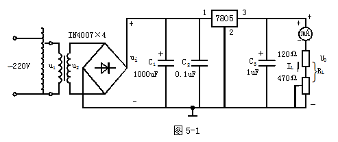 示波器、自耦調(diào)壓器、單相變壓器(220V/12V)、直流毫安表(100mA)、數(shù)字萬用表、LM7805、IN4007(4只)、電解電容(1000μF/25V、10μF/25V、1μF/25V)、瓷片電容0.1μF、電阻(120Ω)、電位器(470Ω/2W)。