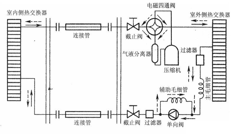如下圖所示。熱泵型空調(diào)器的制熱工況與制冷工況不同。制熱時,為了從室外低溫狀態(tài)下獲取更多的熱量,需要室外熱交換器(蒸發(fā)器)溫度更低,因此要增大系統(tǒng)高、低壓壓差,在主毛細管的基礎(chǔ)上又增加了輔助毛細管。制冷時,單向閥將輔助毛細管短路,只有主毛細管起作用。當只有輔助毛細管堵塞時,制冷可以正常進行,制熱氣路不通,不能制熱。
