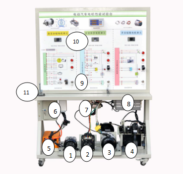 純電動汽車電機性能實驗臺部件說明:1-直流永磁電機;2-交流異步電機;3-開關(guān)磁阻電機;4-電池組;5-電池組;6-直流永磁電機控制器;7-交流異步電機控制器;8-開關(guān)磁阻電機控制器;9-原理面板;10-電壓電流表、轉(zhuǎn)速表、扭矩表、功率表;11-電源總開關(guān);
