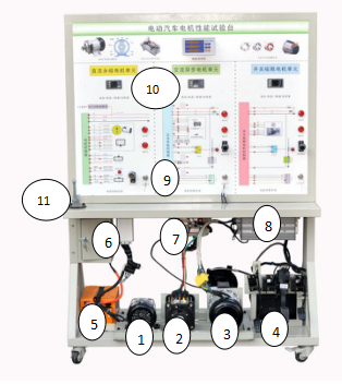 1-直流永磁電機;2-交流異步電機;3-開關(guān)磁阻電機;4-電池組;5-電池組;6-直流永磁電機控制器;7-交流異步電機控制器;8-開關(guān)磁阻電機控制器;9-原理面板;10-電壓電流表、轉(zhuǎn)速表、扭矩表、功率表;11-電源總開關(guān);