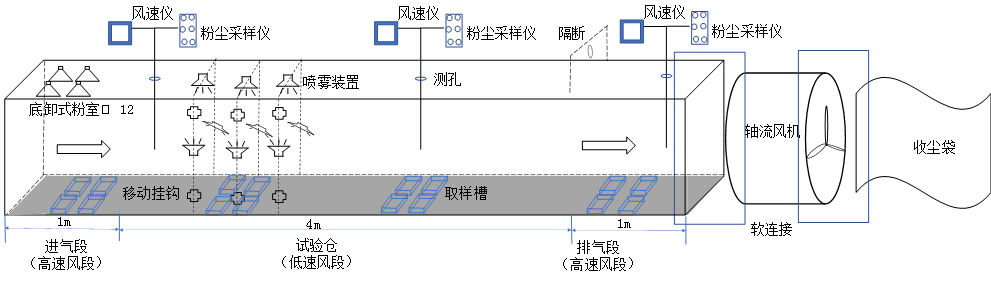 3、風(fēng)道內(nèi)(隔斷)設(shè)置風(fēng)向調(diào)節(jié)裝置、風(fēng)速儀、離線取樣槽、粉塵采樣儀測口等;進(jìn)風(fēng)段安設(shè)12個(gè)底卸式粉室,確保試驗(yàn)階段粉塵連續(xù)供給;試驗(yàn)段下部安設(shè)可移動(dòng)、可升降支架。風(fēng)道尺寸滿足風(fēng)道內(nèi)流速可達(dá)0.1~10m/s,開啟軸流風(fēng)機(jī),調(diào)整頻率可改變平臺內(nèi)部風(fēng)速,可在實(shí)驗(yàn)平臺中部開孔處使用便攜式風(fēng)速儀對風(fēng)速進(jìn)行測試。