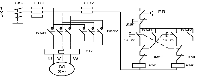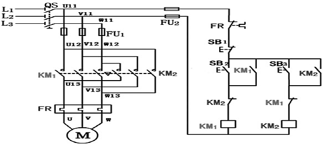三種電路均由電源隔離開關(guān)QS;交流接觸器KM1、KM2;熱繼電器FR;熔斷器FU1、FU2,啟動(dòng)按鈕SB2、SB3;停止按鈕SB1及電動(dòng)機(jī)M組成。電路中各個(gè)元件的文字符號(hào)、圖形表示、工作原理、實(shí)物的觸點(diǎn)等,是學(xué)習(xí)電路工作原理的基礎(chǔ)。