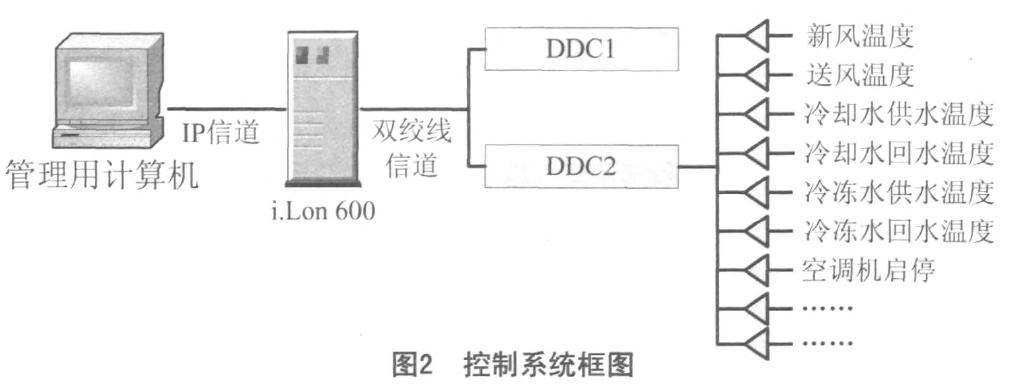 圖5空調(diào)水系統(tǒng)監(jiān)控原理圖中有兩個(gè)循環(huán)系統(tǒng),每個(gè)循環(huán)系統(tǒng)都連有進(jìn)出冷水機(jī)組側(cè)的溫度傳感器,水泵和電動(dòng)閥。冷水溫度的控制是根據(jù)室內(nèi)溫度傳感器的反饋信息來(lái)經(jīng)DDC計(jì)算控制水閥的開度進(jìn)而控制冷水的溫度。
