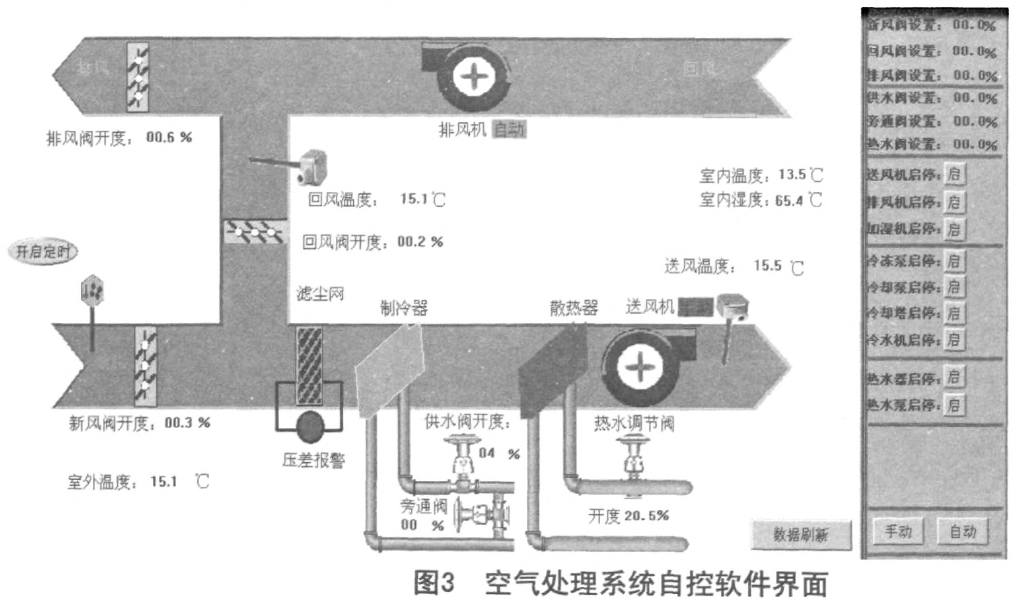 系統(tǒng)運(yùn)行時(shí)有兩種控制狀態(tài):自動(dòng)控制狀態(tài)和手動(dòng)控制狀態(tài)。當(dāng)選擇自動(dòng)控制模式時(shí),通過(guò)傳感器檢測(cè)到的模擬房間溫度、風(fēng)系統(tǒng)溫度、水系統(tǒng)溫度以及壓差信號(hào)作為反饋,根據(jù)控制算法實(shí)時(shí)地控制電動(dòng)閥、壓差開關(guān)、電動(dòng)風(fēng)閥,從而使模擬房間的溫度、新風(fēng)量達(dá)到目標(biāo)值。當(dāng)選擇手動(dòng)控制模式時(shí),所有控制用電動(dòng)閥、壓差開關(guān)、電動(dòng)風(fēng)閥的控制都由操作人員直接用鼠標(biāo)點(diǎn)擊操作的方式進(jìn)行控制。其中空氣處理系統(tǒng)自控軟件界面如圖3所示。