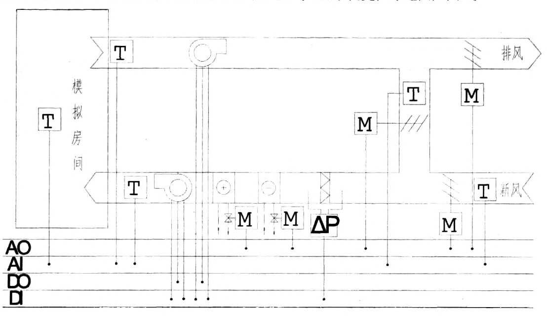 由以上連接可以通過(guò)同風(fēng)管、送風(fēng)管、模擬房間、新風(fēng)側(cè)的溫度傳感器經(jīng)模擬信號(hào)輸入端送至DDC控制器中,經(jīng)采樣、模擬/數(shù)字轉(zhuǎn)換將模擬溫度信號(hào)變成數(shù)字信號(hào),與給定溫度值進(jìn)行比較得出偏差,經(jīng)DDC控制器運(yùn)算,從輸出端口輸出與偏差成一定關(guān)系的信號(hào),夏天輸入的2~15℃的冷凍水流量,對(duì)空氣進(jìn)行等濕冷卻或除濕冷卻,冬季控制輸入的30℃以上的熱水流量,可以對(duì)空氣進(jìn)行加熱,從而實(shí)現(xiàn)對(duì)送風(fēng)溫度、濕度的調(diào)節(jié);過(guò)渡季節(jié)控制新風(fēng)閥、排風(fēng)閥與混合段風(fēng)閥的開度,調(diào)節(jié)系統(tǒng)回風(fēng)與新風(fēng)混合比例,以適應(yīng)冷熱負(fù)荷的變化。在DDC控制器中,可以根據(jù)控制對(duì)象的不同特性,選用最合適的控制算法編程,如新風(fēng)溫度補(bǔ)償控制、模糊控制等,以保證在滿足舒適性的同時(shí),最大程度地節(jié)能。