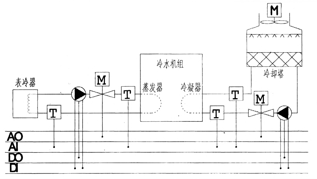 對(duì)空調(diào)水系統(tǒng)進(jìn)行監(jiān)控制的主要要求有:1.保證冷水機(jī)組蒸發(fā)器側(cè)有足夠的水量使蒸發(fā)器正常工作:2.冷水機(jī)組可以向空調(diào)機(jī)組的表冷器提供足夠的冷水量以滿足使用要求;3.保證冷水機(jī)組冷凝器側(cè)有足夠的冷卻水通過(guò);4.保證冷卻塔風(fēng)機(jī)和各水泵的安全運(yùn)行?照{(diào)水系統(tǒng)監(jiān)控原理圖如圖5。
