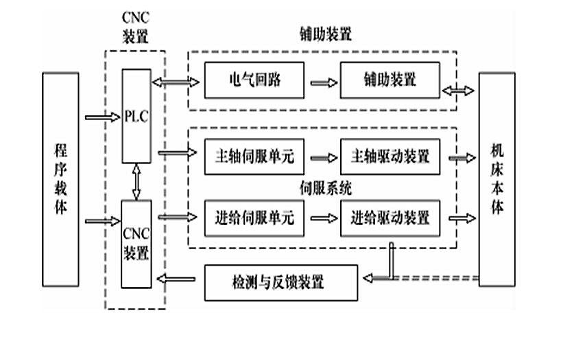 數(shù)控機(jī)床的基本組成包括加工程序載體、數(shù)控裝置、伺服驅(qū)動(dòng)裝置、機(jī)床主體和其他輔助裝置。各組成部分的基本工作原理如下: