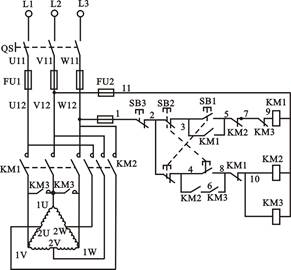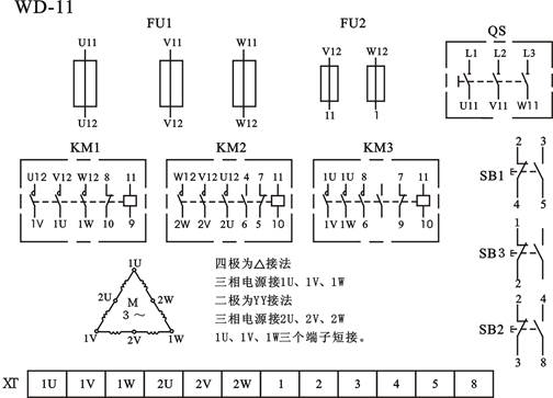 該控制線路的工作原理如下:先合上電源開關(guān)QS,按下低速起動按鈕SB1,接觸器KM1線圈獲電,聯(lián)鎖觸頭斷開,自鎖觸頭閉合,電動機定子繞組作△聯(lián)結(jié),電動機低速運轉(zhuǎn)。如需換為高速動轉(zhuǎn),可按下高速起動按鈕SB2,接觸器KM1線圈斷電釋放,主觸頭斷開,自鎖觸頭斷開、聯(lián)鎖觸頭閉合,同時接觸器KM2和KM3線圈獲電動作,主觸頭閉合,使電動機定子繞組接成雙Y并聯(lián),電動機高速運轉(zhuǎn)。因為電動機的高速運轉(zhuǎn)是KM2和KM3兩個接觸器來控制的,所以把它們的常開輔助觸頭串聯(lián)起來作為自鎖,只有當(dāng)兩個接觸器都閉合時,才允許工作。
