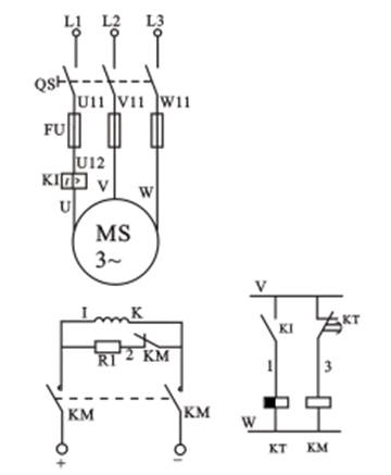 圖1中,KI為電流繼電器,KM為接觸器,KT為時間繼電器。同步電動機(jī)起動時,定子中很大的起動電流使電流繼電器KI吸合,時間繼電器KT,線圈通電吸合,其延時閉合的動斷觸頭瞬時斷開,切斷接觸器KM的線圈回路,因此,勵磁繞組中沒有電流,且通過放電電阻R1短接。當(dāng)同步電動機(jī)的轉(zhuǎn)速達(dá)到準(zhǔn)同步速時,定子電流下降到使電流繼電器KI釋放,使時間繼電器KT斷電釋放,經(jīng)一定延時后,延時閉合的動斷觸頭閉合,KM通電吸合,切除放電電阻R1,并投入勵磁電流。