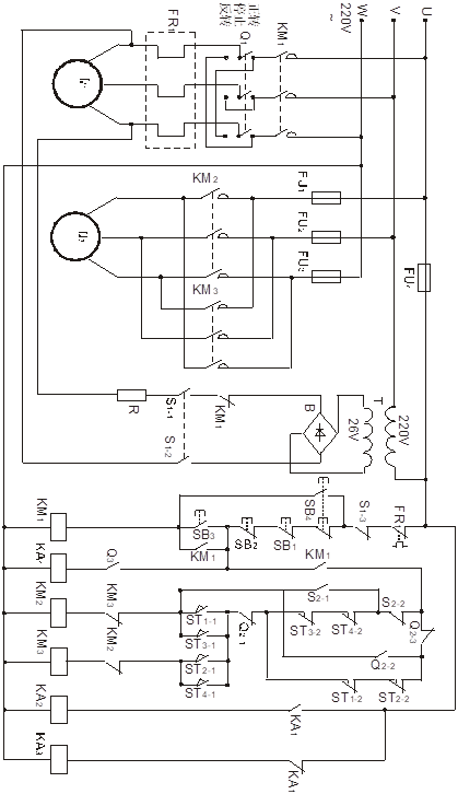 按圖7-24接線,其中M1選用DQ10三相鼠籠電動機,M2選用DQ18三相雙速異步電動機(低速),KM1、KM2、KM3、FR1、SB1、SB2、SB3、T、B、R選用DQ39組件,Q1、Q2、Q3、SB4、FU1、FU2、FU3、FU4、ST1、ST2、ST3、ST4、KA1、KA2選用DQ39-1組件,KA3選用DQ39-2組件,S1、S2選用DQ31組件。