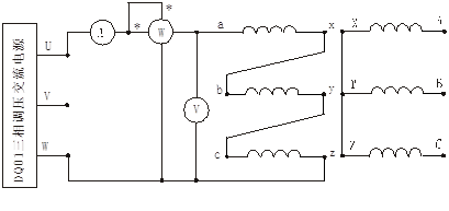 被測變壓器選用三相心式變壓器DQ06,用其中高壓和低壓兩組繞組,額定容量PN=152/152W,UN=220/55V,IN=0.4/1.6A,Y/Y接法。測得阻值大的為高壓繞組,用A、B、C、X、Y、Z標(biāo)記。低壓繞組標(biāo)記用a、b、c、x、y、z。