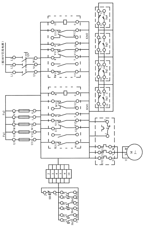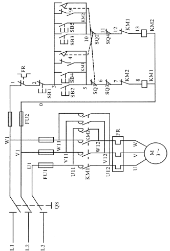 如按下按鈕開(kāi)關(guān)SB2,則KM1得電而吸合,且KM1自鎖,電機(jī)運(yùn)轉(zhuǎn)。設(shè)備運(yùn)動(dòng)到設(shè)定的位置后,SQ1動(dòng)作,KM1失電,KM2得電,電機(jī)反向運(yùn)轉(zhuǎn),帶動(dòng)設(shè)備反向運(yùn)動(dòng),循環(huán)往復(fù)。