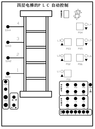 2、圖中SIN1~SIN4為四個霍爾開關(guān),分別接到PLC的四個輸入點,作為控制電梯的各程開關(guān),當(dāng)電梯經(jīng)過霍爾開關(guān)時,開關(guān)輸出0信號。PO1~PO6是六個呼叫按鈕,用來表示一到四層的呼叫信號,L1~L6是六個LED發(fā)光管,用來指示呼叫情況(PLC輸出點不夠時,可以省略),頂端的一個LED數(shù)碼管用來顯示電梯的所在位置。“啟動”“順/逆”是步進電機的兩個控制信號,電梯的升降依靠PLC控制步進電機帶動皮帶輪轉(zhuǎn)動來實現(xiàn),步進電機的驅(qū)動由演示板內(nèi)部了一個單片機來控制。