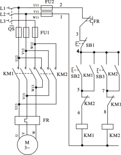 仔細(xì)檢查確認(rèn)接線無誤后,接通交流電源,按下SB2,電機(jī)應(yīng)正轉(zhuǎn)(電機(jī)右側(cè)的軸伸端為順時針轉(zhuǎn),若不符合轉(zhuǎn)向要求,可停機(jī),換接電機(jī)定子繞組任意兩個接線即可)。按下SB3,電機(jī)仍應(yīng)正轉(zhuǎn)。如要電機(jī)反轉(zhuǎn),應(yīng)先按SB1,使電機(jī)停轉(zhuǎn),然后再按SB3,則電機(jī)反轉(zhuǎn)。若不能正常工作,則應(yīng)分析并排除故障,使線路能正常工作。