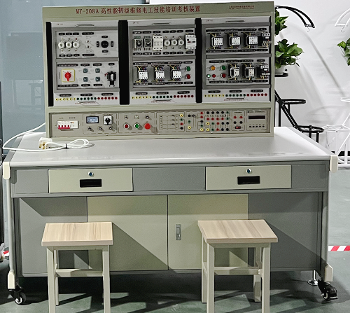 一、MY-208A 初級(jí)電工技能實(shí)訓(xùn)設(shè)備-是根據(jù)勞動(dòng)和社會(huì)保障部頒發(fā)的維修電工初、中級(jí)考核培訓(xùn)技能內(nèi)容所要求的電氣控制線路和實(shí)用電子線路而研發(fā)的實(shí)訓(xùn)裝置,通過維修電工實(shí)訓(xùn)裝置的實(shí)訓(xùn)技能操作,能快速掌握該課程的實(shí)用技術(shù)與操作技能。具有針對(duì)性、實(shí)用性、科學(xué)性和先進(jìn)性,該維修電工裝置不僅可供學(xué)生實(shí)訓(xùn)操作,也是各勞動(dòng)職業(yè)技能鑒定部門、大中專院校、職校、技校初級(jí)、中級(jí)維修電工技能考核的理想設(shè)備。