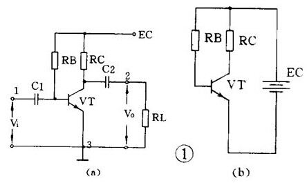 低頻電壓放大器是指工作頻率在20 赫~ 20 千赫之間、輸出要求有一定電壓值而不要求很強的電流的放大器。( 1 )共發(fā)射極放大電路,圖 1 ( a )是共發(fā)射極放大電路,C1 是輸入電容,C2 是輸出電容,三極管 VT 就是起放大作用的器件, RB 是基極偏置電阻 ,RC 是集電極負載電阻。 1 、 3 端是輸入, 2 、 3 端是輸出。 3 端是公共點,通常是接地的,也稱“地”端。靜態(tài)時的直流通路見圖 1 ( b ),動態(tài)時交流通路