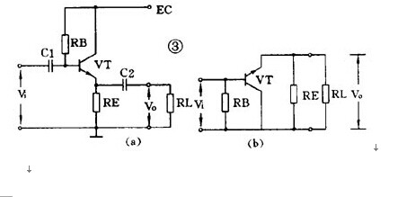 ( 3 )射極輸出器圖 3 ( a )是一個射極輸出器。它的輸出電壓是從射極輸出的。圖 3 ( b )是它的交流通路圖,可以看到它是共集電極放大電路。