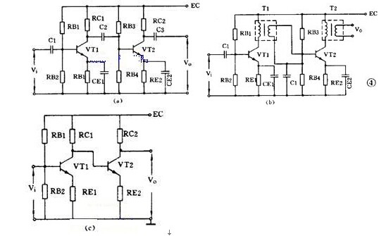 這個圖中,晶體管真正的輸入是 V i 和 V o 的差值,所以這是一個交流負反饋很深的電路。由于很深的負反饋,這個電路的特點是:電壓放大倍數(shù)小于 1 而接近 1 ,輸出電壓和輸入電壓同相,輸入阻抗高輸出阻抗低,失真小,頻帶寬,工作穩(wěn)定。它經(jīng)常被用作放大器的輸入級、輸出級或作阻抗匹配之用。   ( 4 )低頻放大器的耦合   一個放大器通常有好幾級,級與級之間的聯(lián)系就稱為耦合。放大器的級間耦合方式有三種: ①RC 耦合,見圖 4 ( a )。優(yōu)點是簡單、成本低。但性能不是最佳。 ② 變壓器耦合,見圖 4 ( b )。優(yōu)點是阻抗匹配好、輸出功率和效率高,但變壓器制作比較麻煩。 ③ 直接耦合,見圖 4 ( c )。優(yōu)點是頻帶寬,可作直流放大器使用,但前后級工作有牽制,穩(wěn)定性差,設(shè)計制作較麻煩。  功率放大器