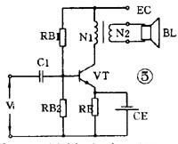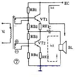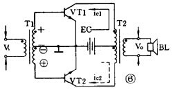 圖 5 是單管功率放大器, C1 是輸入電容, T 是輸出變壓器。它的集電極負載電阻 Ri′ 是將負載電阻 R L 通過變壓器匝數(shù)比折算過來的:  RC′= ( N1 N2 ) 2 RL=N 2 RL   負載電阻是低阻抗的揚聲器,用變壓器可以起阻抗變換作用,使負載得到較大的功率。    這個電路不管有沒有輸入信號,晶體管始終處于導(dǎo)通狀,靜態(tài)電流比較大,困此集電極損耗較大,效率不高,大約只有 35 %。這種工作狀態(tài)被稱為甲類工作狀態(tài)。這種電路一般用在功率不太大的場合,它的輸入方式可以是變壓器耦合也可以是 RC 耦合。   ( 2 )乙類推挽功率放大器  圖 6 是常用的乙類推挽功率放大電路。它由兩個特性相同的晶體管組成對稱電路,在沒有輸入信號時,每個管子都處于截止?fàn)顟B(tài),靜態(tài)電流幾乎是零,只有在有信號輸入時管子才導(dǎo)通,這種狀態(tài)稱為乙類工作狀態(tài)。當(dāng)輸入信號是正弦波時,正半周時 VT1 導(dǎo)通 VT2 截止,負半周時 VT2 導(dǎo)通 VT1 截止。兩個管子交替出現(xiàn)的電流在輸出變壓器中合成,使負載上得到純正的正弦波。這種兩管交替工作的形式叫做推挽電路。