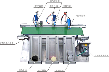 推出氣缸: 推出氣缸使用的是單向電控氣閥。當電控氣閥得電,推桿伸出物料被推出,當電控氣閥斷電,推桿縮回。