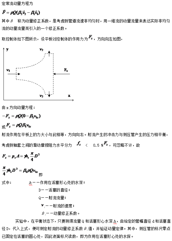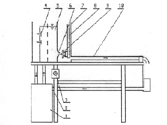 自循環(huán)供水裝置1由離心式水泵和蓄水箱組合而成。水泵的開啟、流量大小的調(diào)節(jié)均由調(diào)速器3控制。水流經(jīng)供水管供給恒壓水箱5,溢流水經(jīng)回水管流回蓄水箱。流經(jīng)管嘴6的水流形成射流,沖擊帶活塞和翼片的抗沖平板9,并以與入射角成90°的方向離開抗沖平板?箾_平板在射流沖力和測壓管8中的水壓力作用下處于平衡狀態(tài);钊涡乃hc可由測壓管8測得。由此可求得射流的沖力,即動量力F。沖擊后的棄水經(jīng)集水箱7匯集后,再經(jīng)上回水管10流出,最后經(jīng)漏斗和下回水管流回蓄水箱。