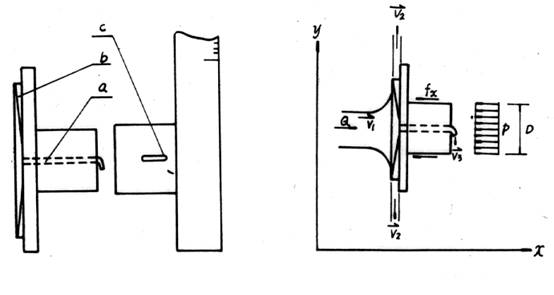 帶活塞和翼片的抗沖平板9和帶活塞套的測壓管8如下左圖所示。該圖是活塞退出活塞套時(shí)的分部件示意圖;钊行脑O(shè)有一細(xì)導(dǎo)水管a,進(jìn)口端位于平板中心,出口端伸出活塞頭部,出口方向與軸向垂直。在平板上設(shè)有翼片b,活塞套上設(shè)有窄槽c。