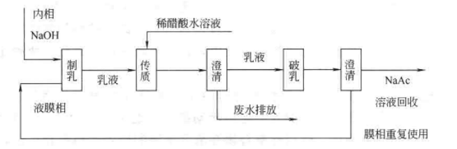 [2]由于欲處理的是醋酸廢水溶液(外相),所以可選用與之不互溶的油性物質(zhì)作為膜相,并選用NaOH水溶液作為內(nèi)相。實驗時,先將膜相與內(nèi)相在一定條件下乳化使兩者形成穩(wěn)定的油包水(W/O)型乳狀液,然后將此乳狀液分散于醋酸廢水(即外相)中。這樣,廢水中的醋酸將以一定的速度穿過液膜向內(nèi)相遷移,并與內(nèi)相NaOH反應(yīng)生成NaAc而被保留在內(nèi)相,從而與廢水分離。然后,將乳液與廢水分離,對乳液進行破乳,回收內(nèi)相中高濃度的NaAc,同時使膜相物質(zhì)再生,以便重復(fù)使用。