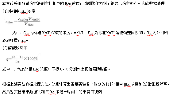 [3] 觀察A1、A2、B2實驗結(jié)果:在一定的時間范圍內(nèi),外相HAc的濃度逐漸降低,分離效率增加,醋酸脫除率增加;