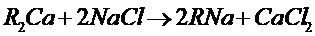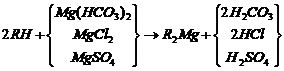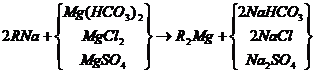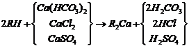 當含有鈣鹽及鎂鹽的水通過裝有陽離子交換樹脂的交換器時,水中的Ca2+及Mg2+便與樹脂中的可交換離子(Na+或H+)交換,使水中Ca2+、 Mg2+含量降低或基本上全部去除,這個過程叫做水的軟化。樹脂失效后要進行再生,即把樹脂上吸附的鈣、鎂離子置換出來,代之以新的可交換離子。鈉離子交換用食鹽(NaCl)再生、氫離子交換用鹽酸(HCl)或硫酸(H2SO4)再生;痉磻饺缦隆