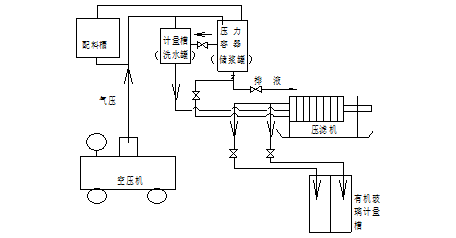 6.約5min后,檢查所有閥門看是否已關(guān)緊?確保全部關(guān)緊后,待空壓機(jī)氣壓達(dá)到0.8Mpa后,打開壓力容器的進(jìn)氣閥,再打開空壓機(jī)出口轉(zhuǎn)換閥送氣,同時注意控制壓力容器的進(jìn)氣閥的開度,控制混合釜壓力表的指示值在0.1MPa左右,并一直維持在恒壓條件下操作,如果壓力過大也可通過壓力容器右側(cè)的放空閥調(diào)節(jié);