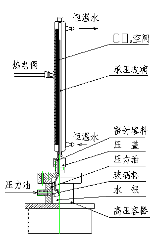 實(shí)驗(yàn)中,由壓力臺(tái)送來(lái)的壓力由壓力油進(jìn)入高壓容器和玻璃杯上半部,迫使水銀進(jìn)入預(yù)先裝了CO2氣體的承壓玻璃管,CO2被壓縮,其壓力和容器通過(guò)壓力臺(tái)上的活塞桿的進(jìn)、退來(lái)調(diào)節(jié)。溫度由恒溫器供給的水套里的水溫來(lái)調(diào)節(jié)。