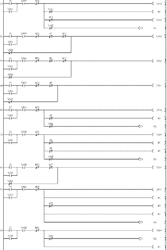 56 ORI X000 57 OUT Y015 58 LD T1 59 OR Y004 60 AND X000 61 ANI M20 62 ANI M5 63 ORI X000 64 OUT Y011 65 LD T2 66 OR Y005 67 AND X000 68 ANI M20 69 OUT Y005 70 MPS 71 ANI M4 72 OUT M3 73 MPP 74 ANI Y006 75 OUT T3 K5 78 LD T3 79 OR Y006 80 AND X000 81 ANI M20 82 OUT Y006 83 MPS 84 ANI M6 85 OUT M5 86 MRD 87 ANI M8 |