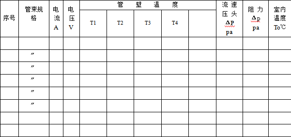 4.在一定熱負(fù)荷下,通過調(diào)整風(fēng)量來改變Re數(shù)的大小,因此保持調(diào)壓膜塊的輸出電壓不變,依次調(diào)節(jié)風(fēng)機(jī)出口擋板,在各個(gè)不同的的開度下測(cè)得其動(dòng)壓頭,空氣進(jìn)、出口溫度以及,即為不同風(fēng)速下,同一負(fù)荷時(shí)的實(shí)驗(yàn)數(shù)據(jù)。