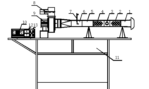 1、集流段;  2、插排前段;  3、實(shí)驗(yàn)段;  4、插排后段;  5、收縮段;6、測(cè)速段;   7、畢托管; 8、風(fēng)門調(diào)節(jié)閘門; 9、風(fēng)機(jī); 10、配電箱; 11實(shí)驗(yàn)臺(tái)架;13、微差壓計(jì)